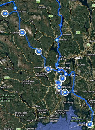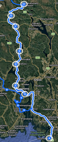 Ruten går mot kysten og inkluderer ferjeoverfart til Moss.